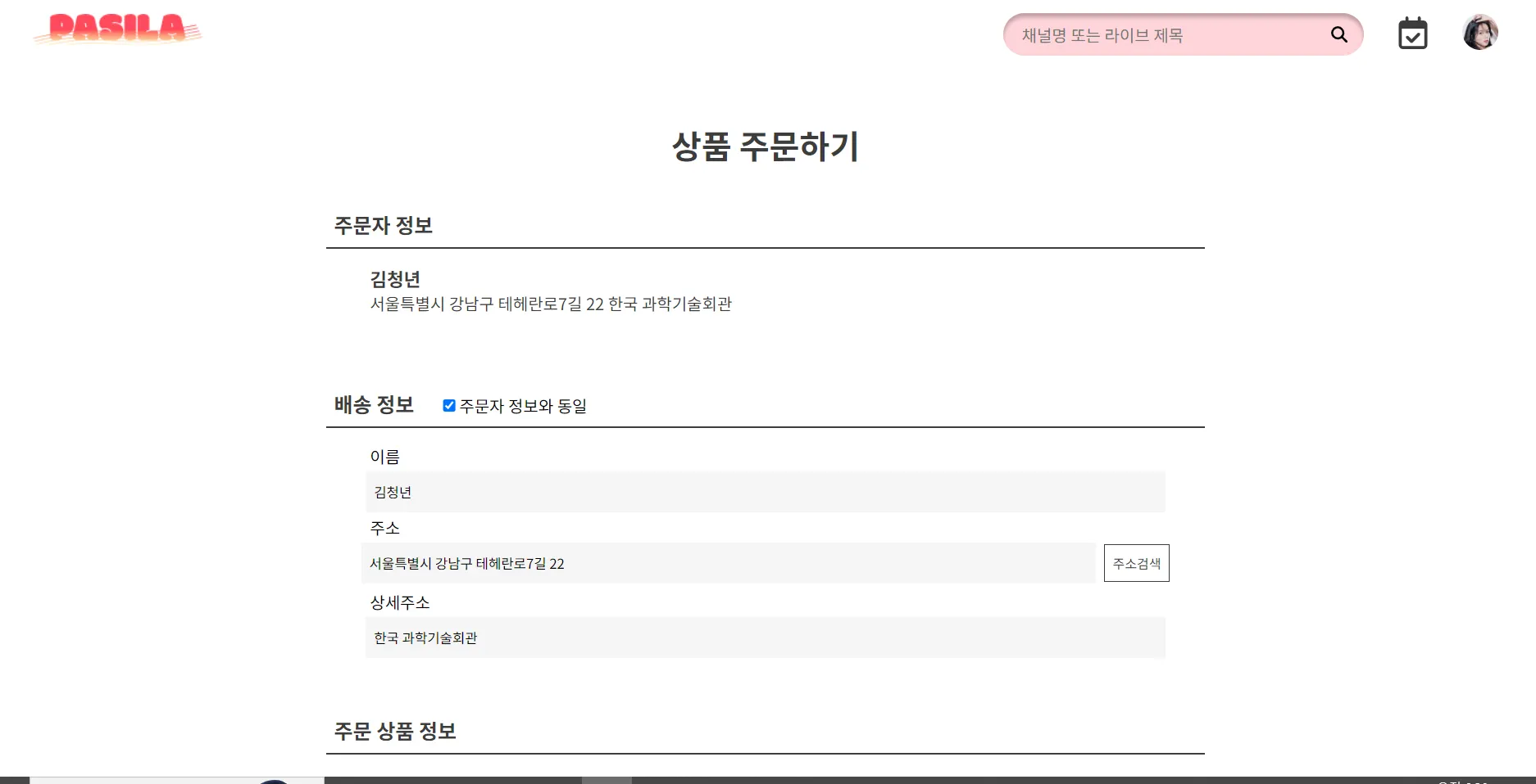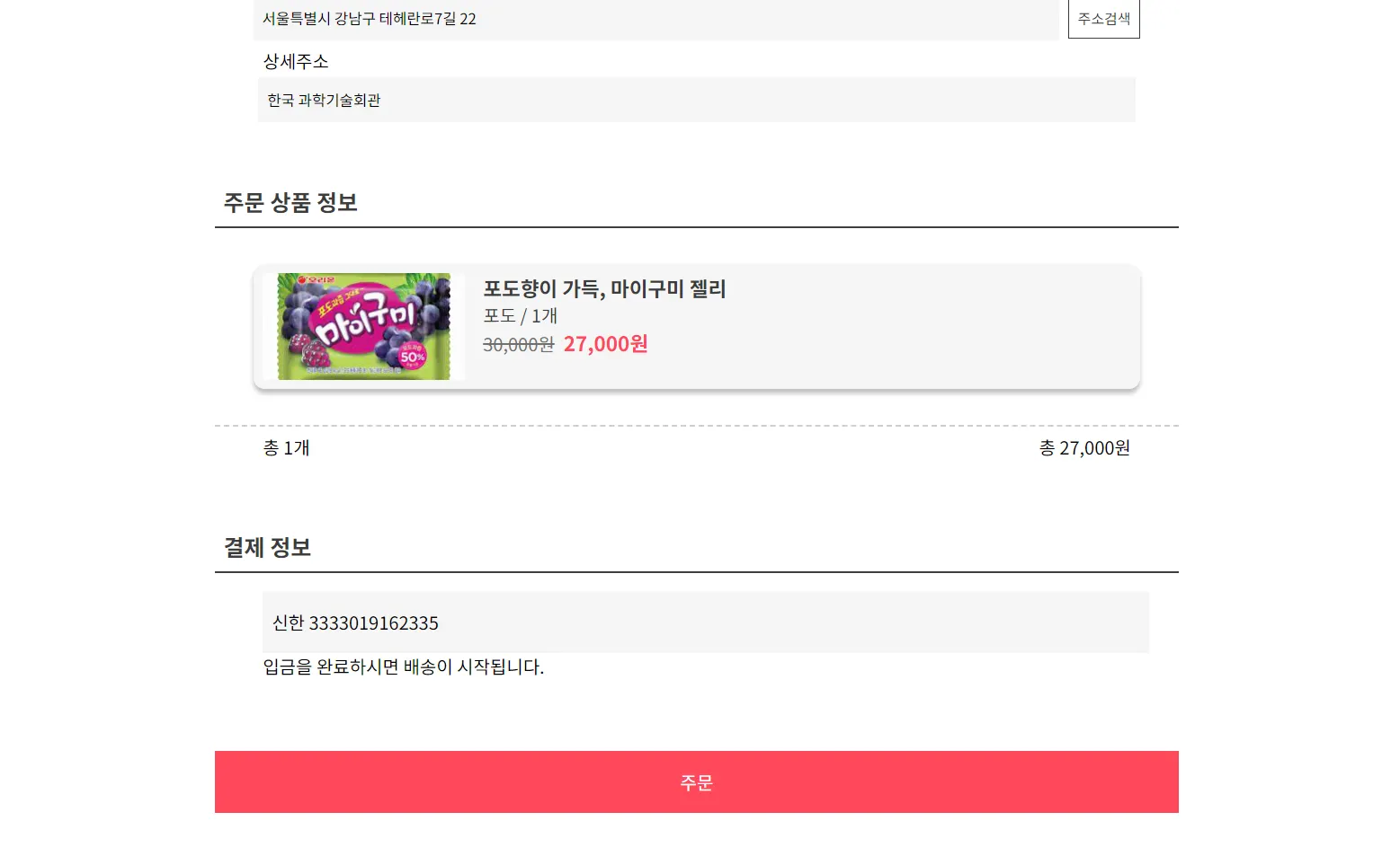주문을 클릭하면 배송 정보 입력, 상품 정보를 확인하고 주문하기를 클릭합니다.