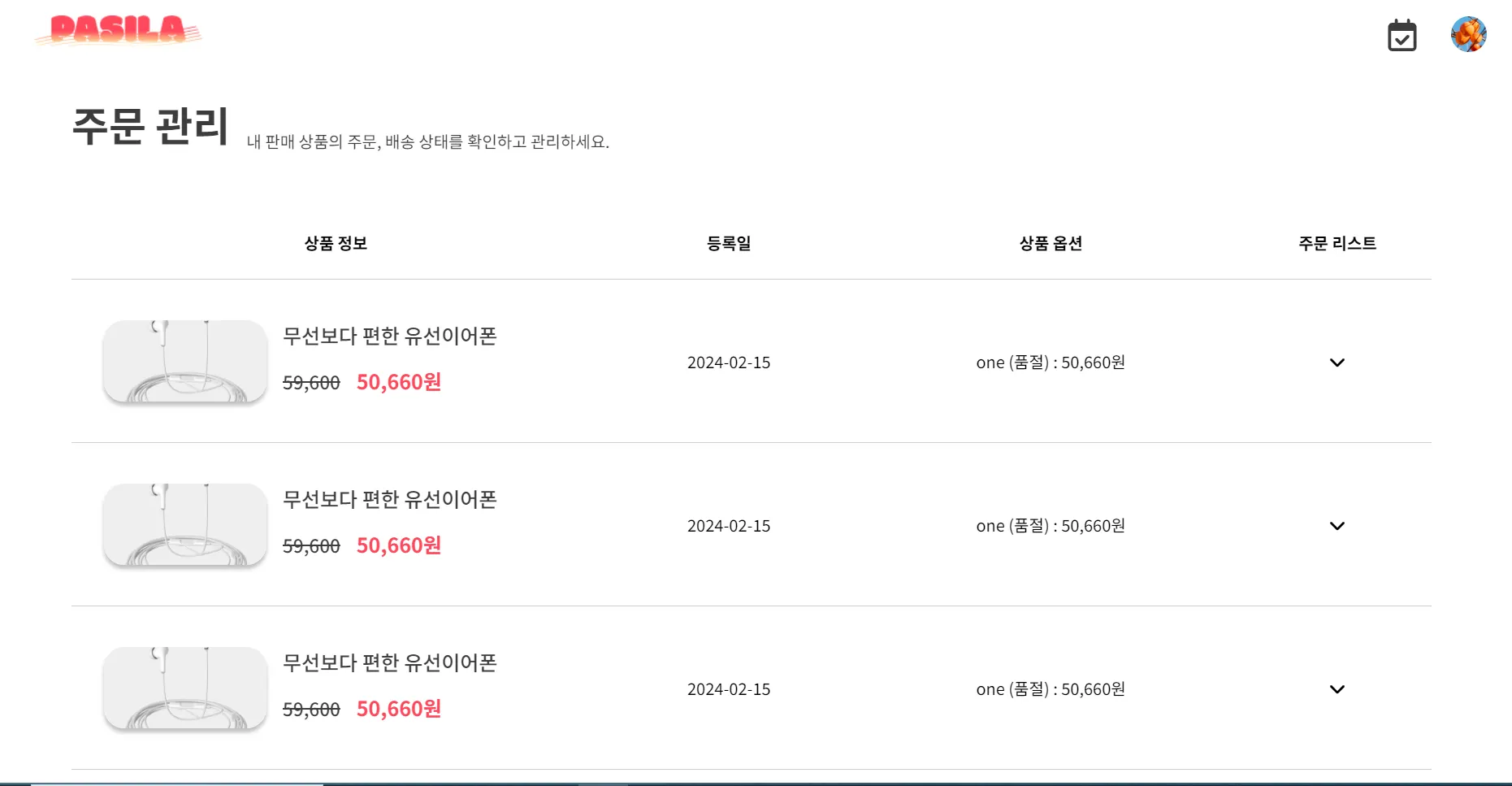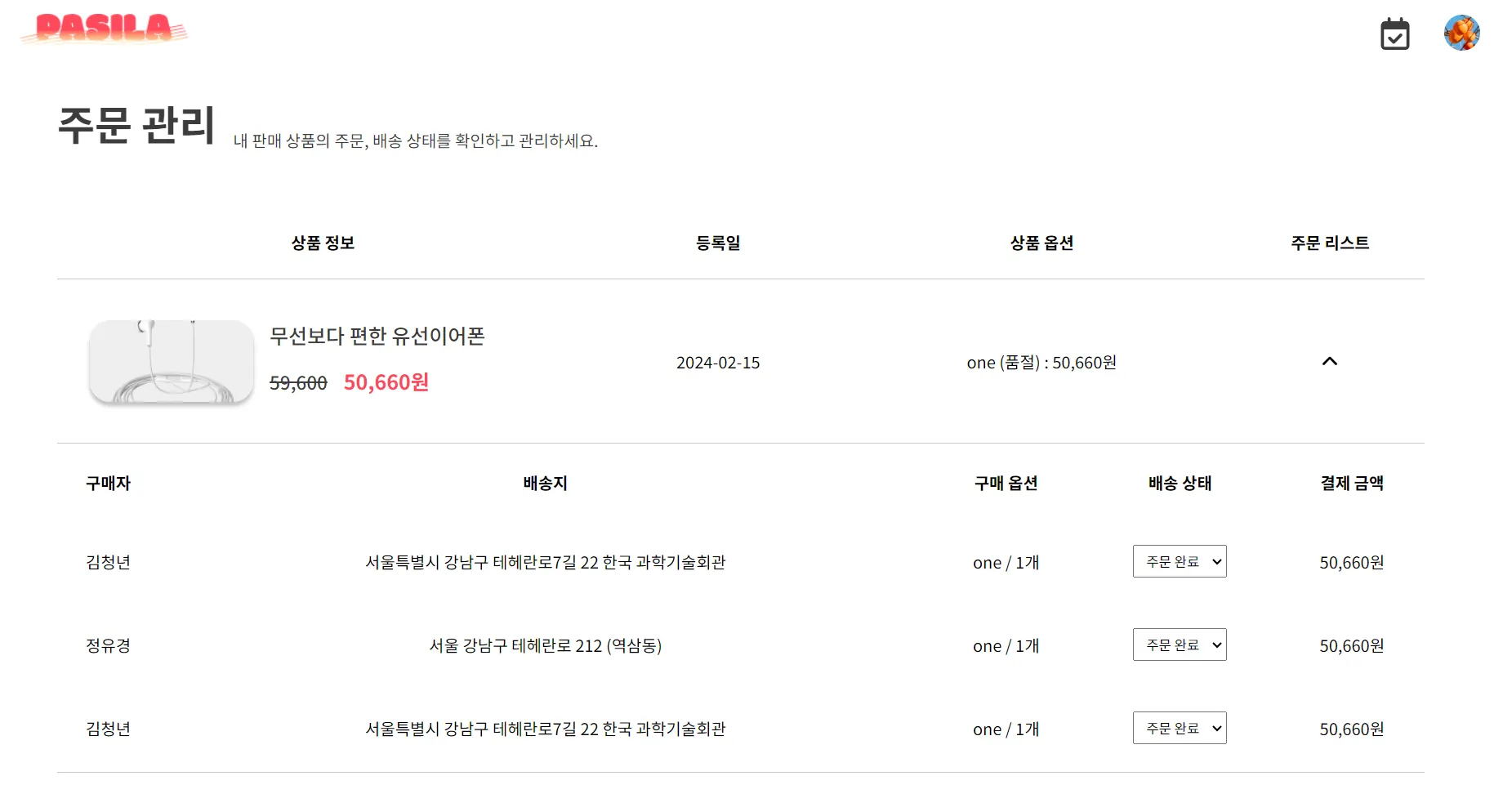 주문 관리 페이지에서 주문 리스트를 확인하고 주문상태를 변경할 수 있습니다.