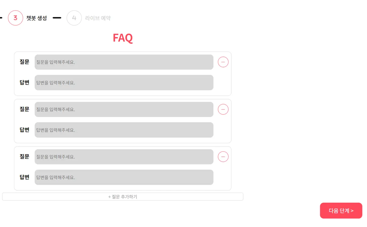 챗봇 생성 단계에서 구매자들이 많이 질문할 것 같은 내용의 QnA를 작성합니다.