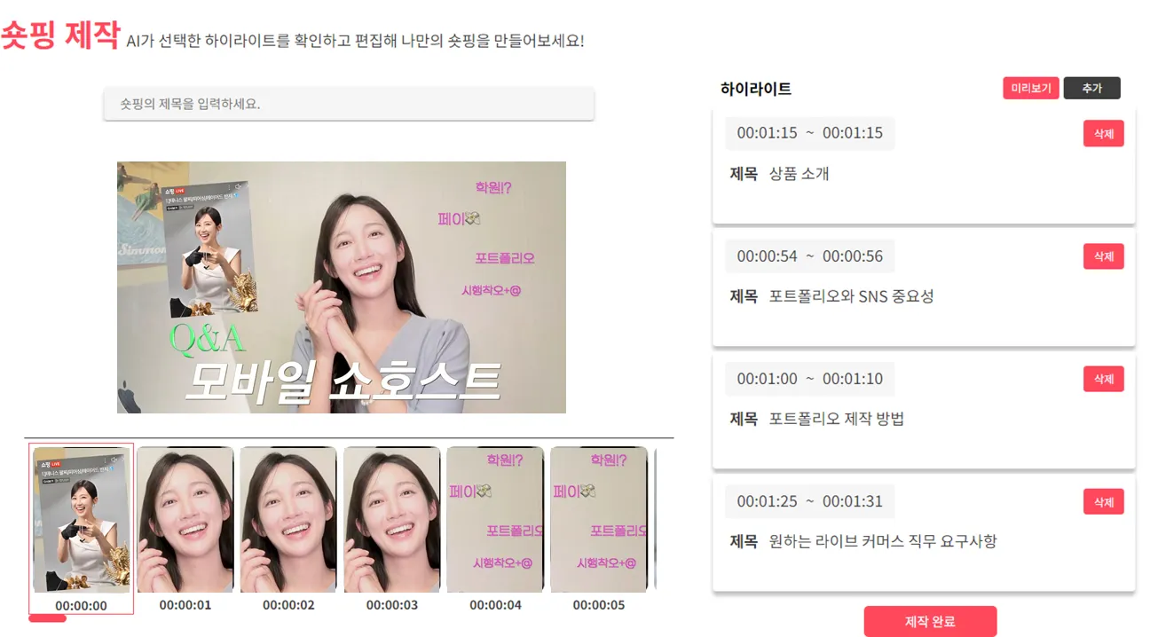 제작 완료 버튼을 누르면 숏핑이 완성되고 아래와 같이 숏핑을 확인할 수 있습니다.