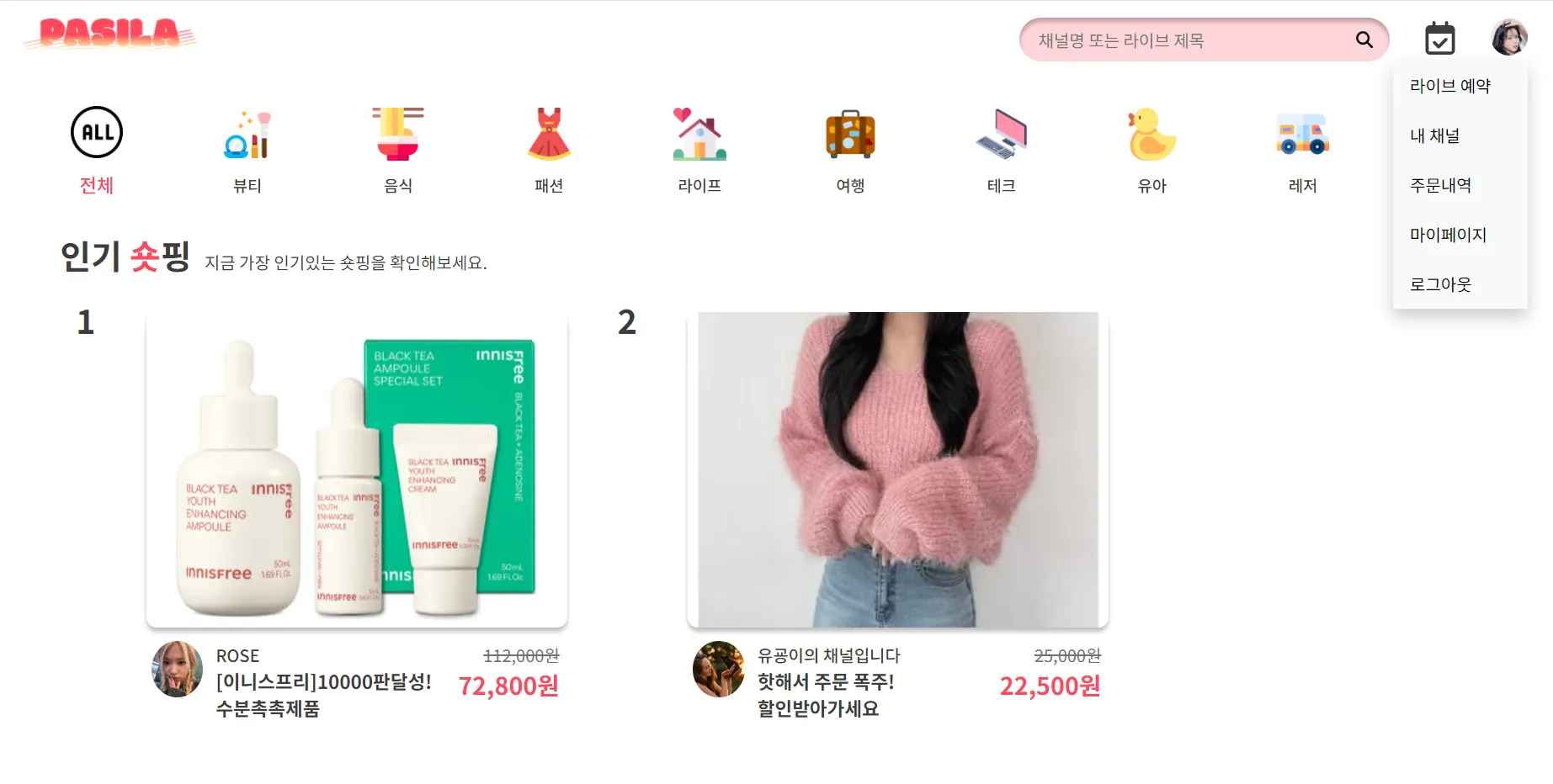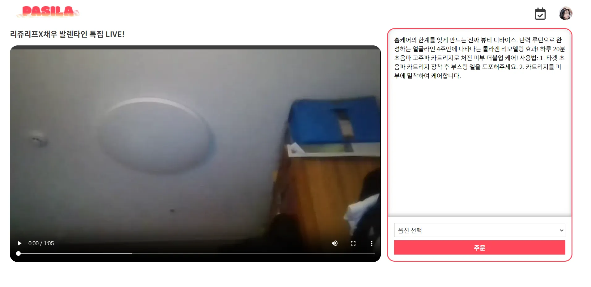 숏핑 클릭 시, 숏핑을 시청할 수 있고 오른쪽 패널에서 상품 정보와 주문이 가능합니다.