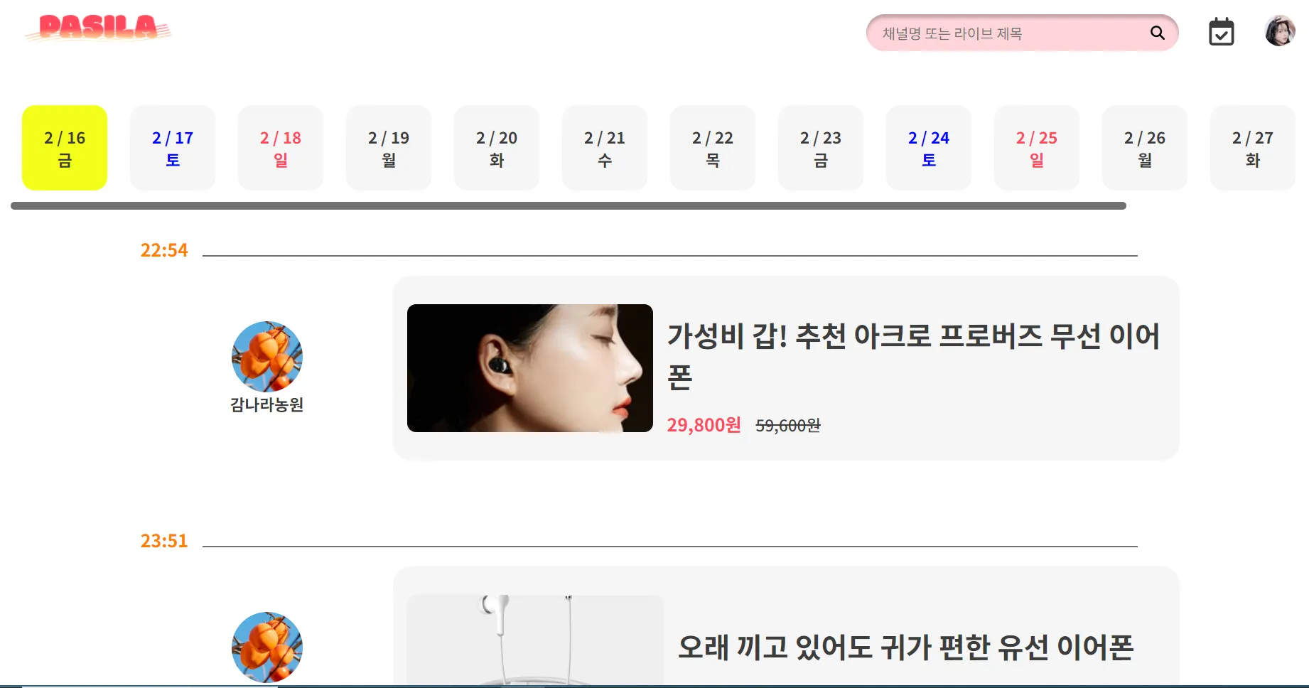 오른쪽 상단의 달력을 클릭하여 날짜별 예정 라이브를 확인할 수 있습니다.