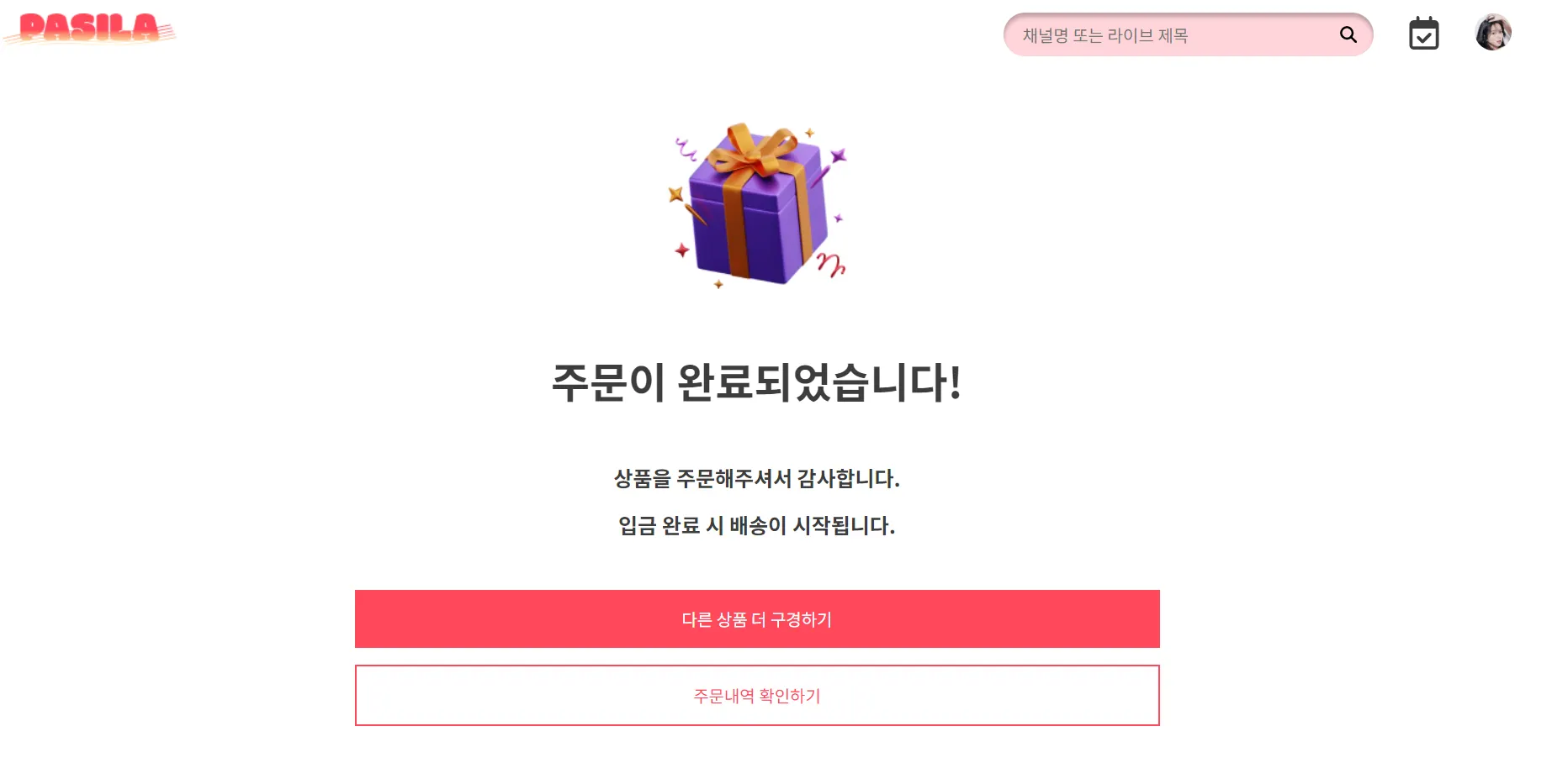 주문이 완료되었다는 알림과 함께 해당 페이지로 이동합니다.
