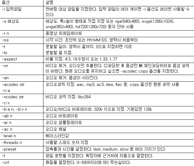 영상을 자를 때 -ss 옵션은 -i 옵션 뒤 쪽에 위치시켜 줘야 한다. 그렇지 않으면 -t 옵션을 인식하지 못했다.
