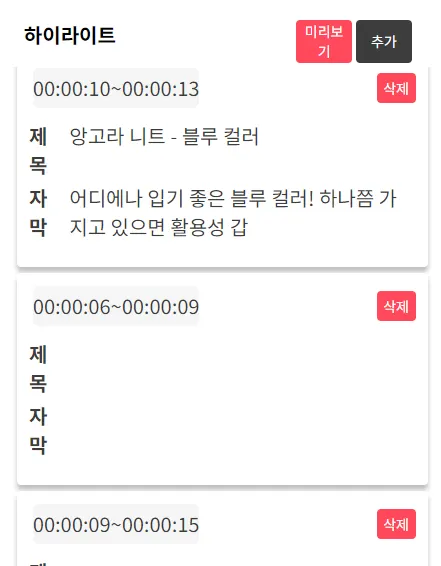 이런식으로 하이라이트 자르는 시간이 전에 잘랏던 시간보다 전이거나, 시간이 겹치게 된다면 영상이 멈추는 문제가 발생했다.