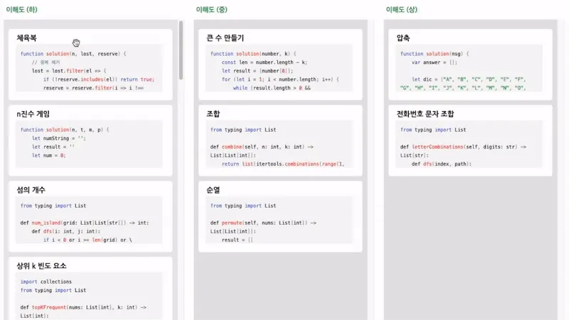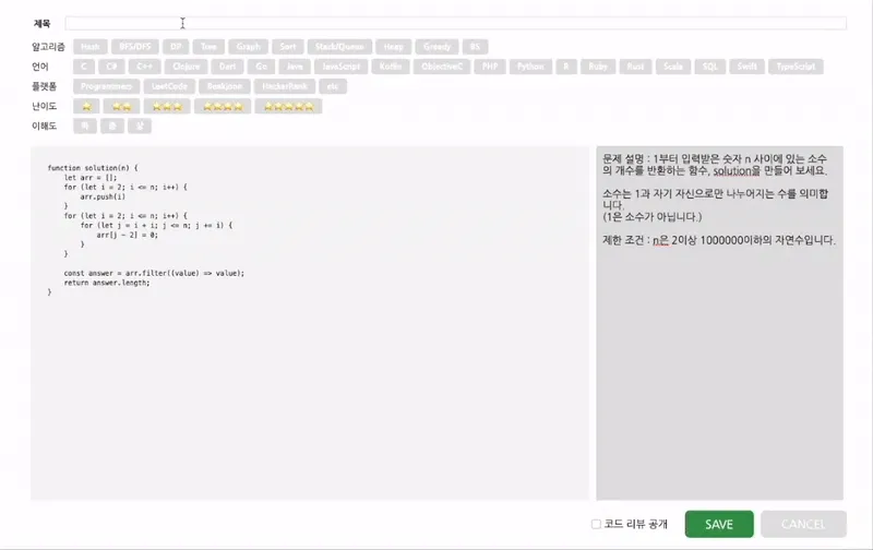 알고리즘 문제 풀이 코드나 작성한 코드를 분류하여 저장하고 이해도에 따라 정리해보세요. 내가 작성한 코드를 공개하여 다른 사람들의 코드리뷰를 받아 실력을 더 높여보세요.