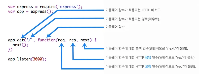 미들웨어 함수는 요청 오브젝트(req), 응답 오브젝트(res), 그리고 그 다음의 미들웨어 함수에 대한 액세스 권한을 갖는 함수로 이루어져 있음