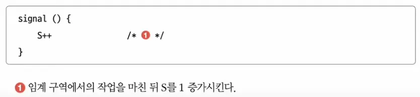 임계 구역 앞에서 기다리는 프로세스에 들어가도 된다는 신호 전달: signal 함