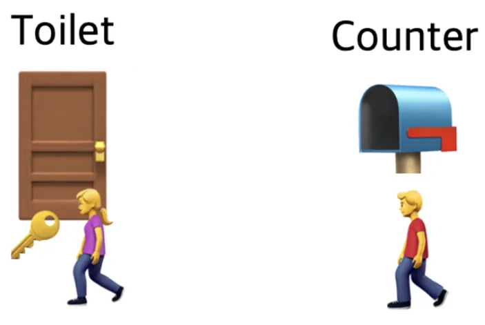 카운터에 열쇠가 있다면 화장실에 사람이 없다는 뜻이고 열쇠를 이용해 화장실에 들어갈 수 있음.